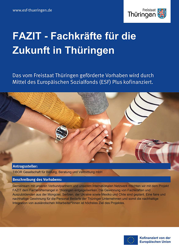 FAZIT wird gefördert durch den Freistaat Thüringen aus Mitteln des Europäischen Sozialfonds Plus. Gemeinsam mit unseren Verbundpartnern und unserem internationalen Netzwerk möchten wir mit dem Projekt FAZIT dem Fachkräftemangel in Thüringen entgegenwirken. Die Gewinnung von Fachkräften und Auszubildenden aus der Mongolei, Serbien, der Ukraine sowie Brasilien und Chile sind geplant. Eine faire und nachhaltige Gewinnung für die Personal Bedarfe der Thüringer Unternehmen und somit die nachhaltige Integration von ausländischen Mitarbeiter*Innen ist höchstes Ziel des Projektes.